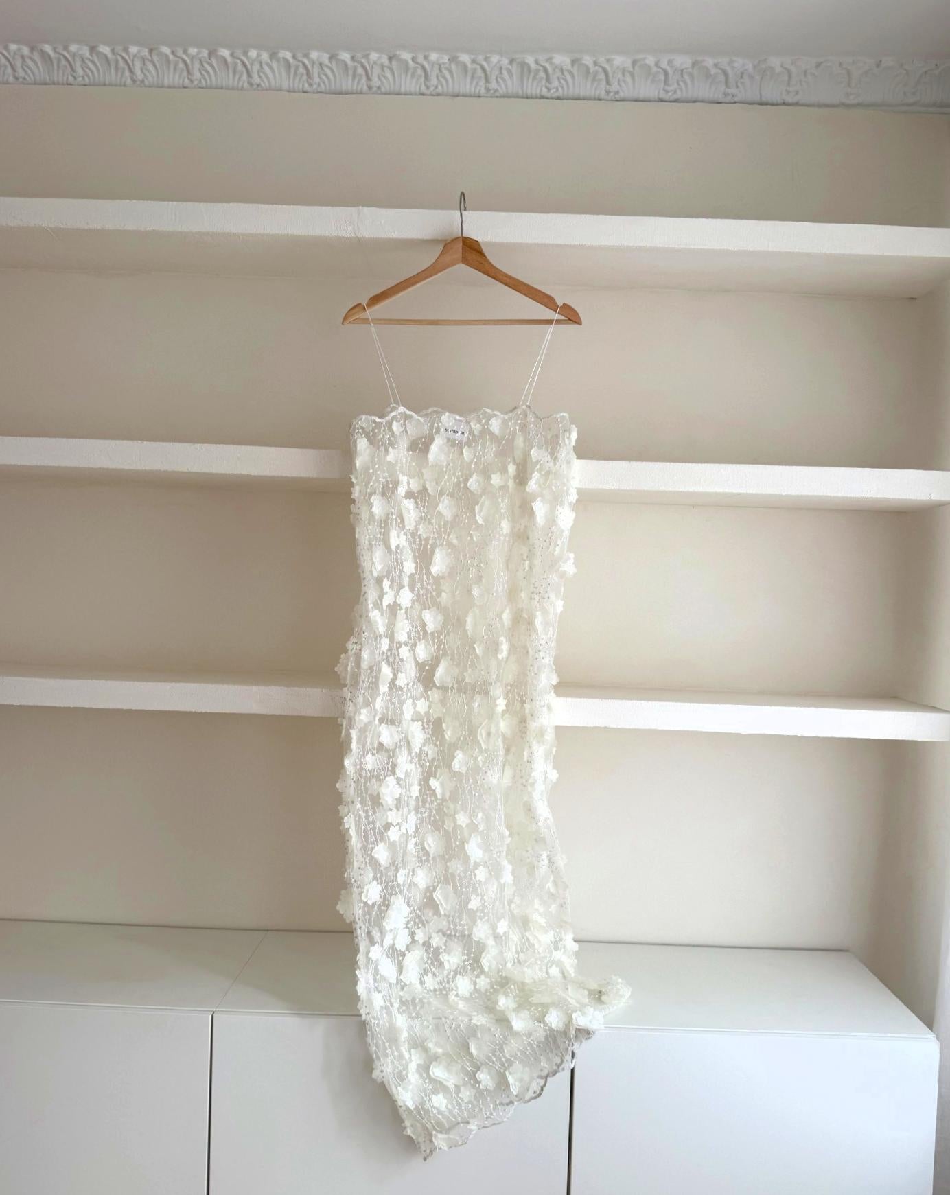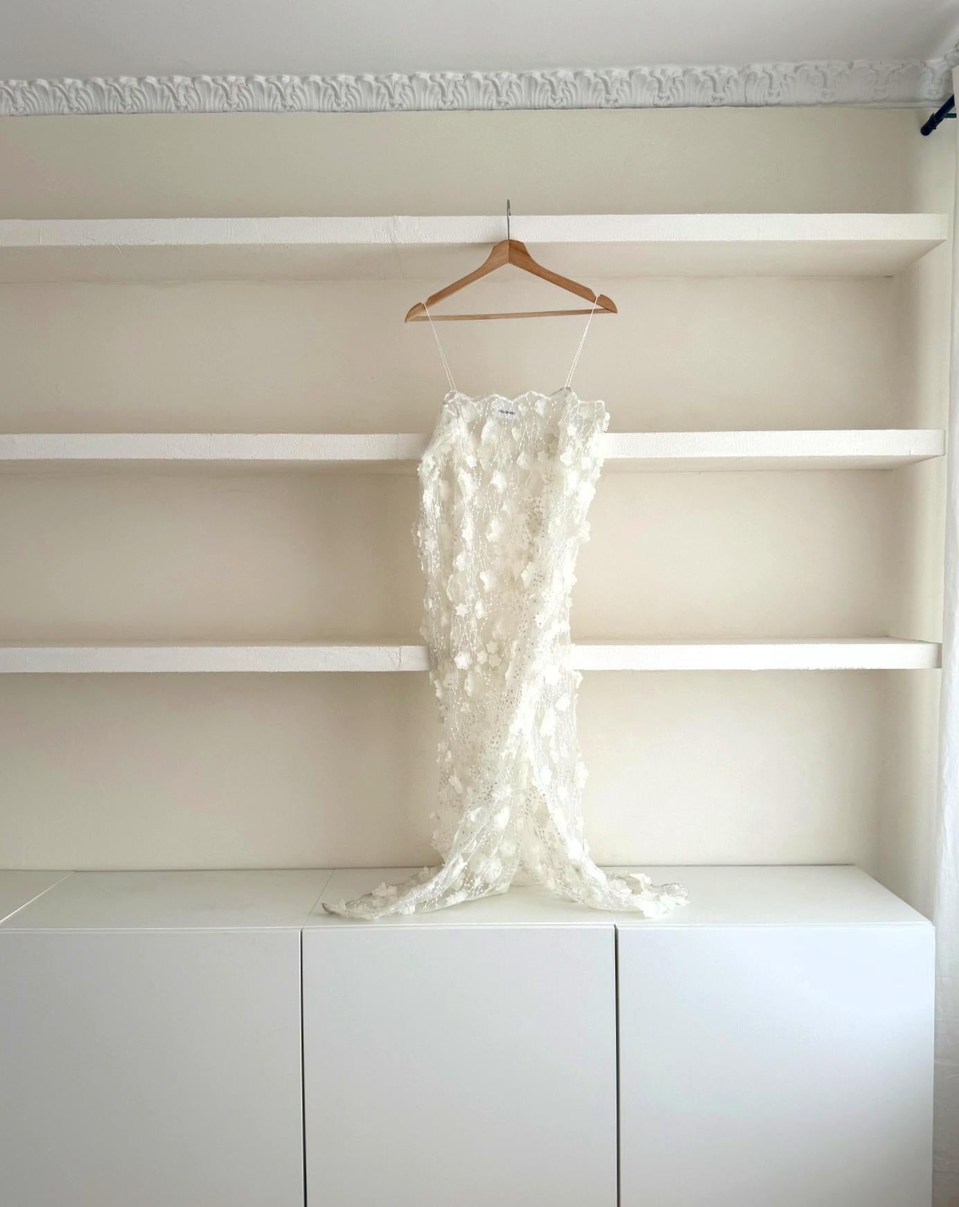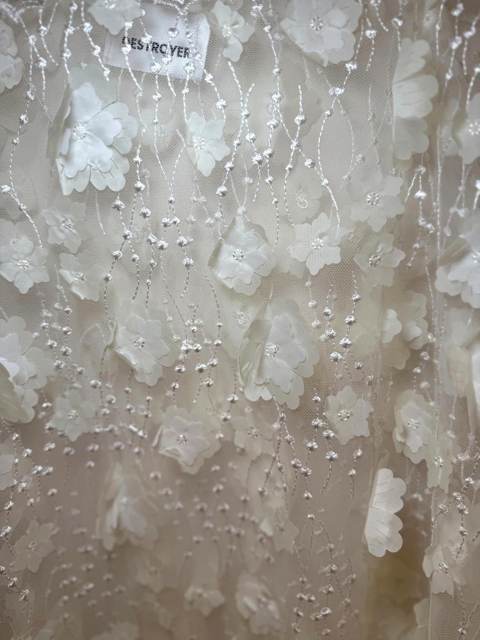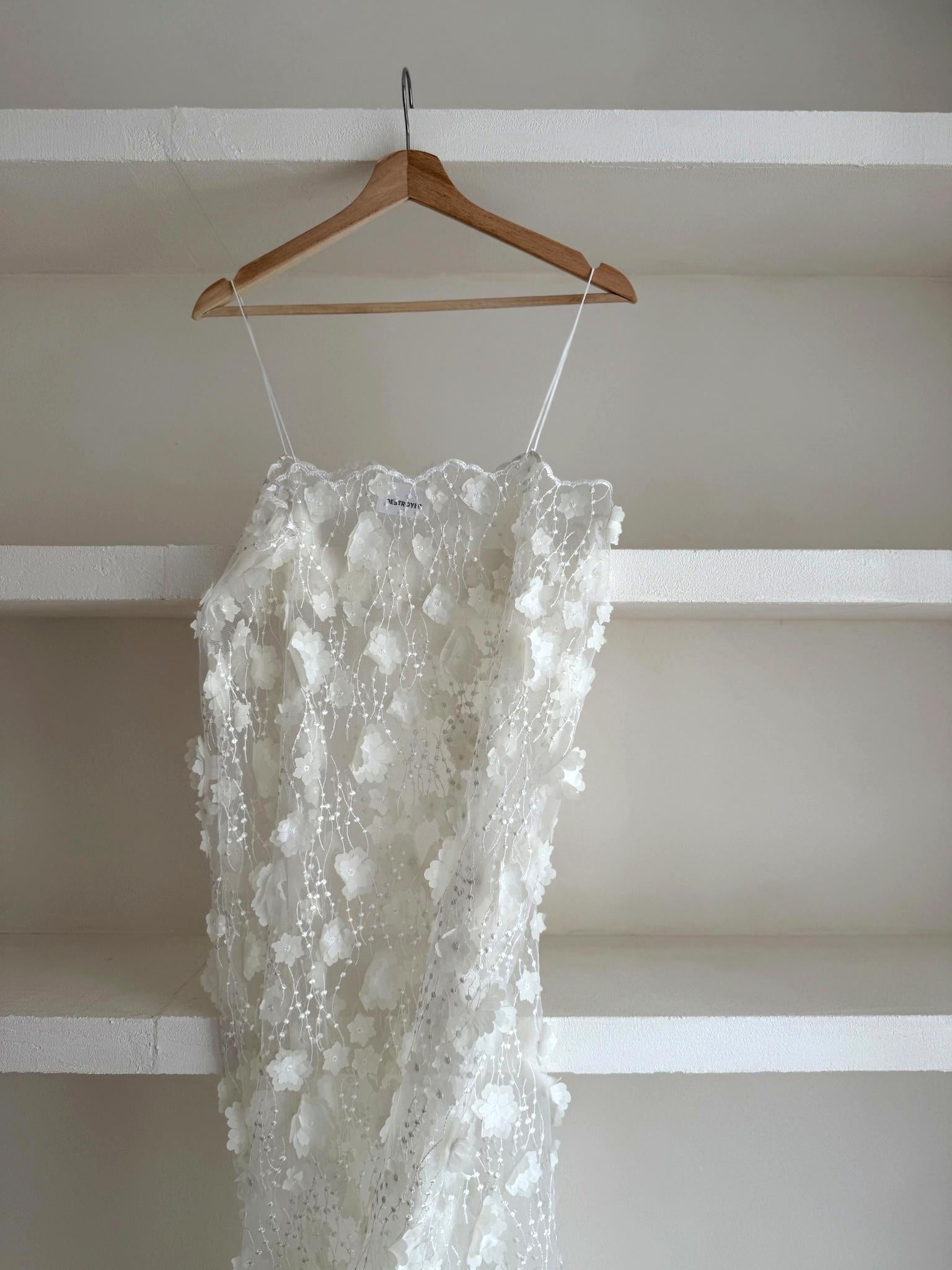 Crafted from soft tulle and adorned with intricate 3D floral appliqués. With thin straps and a clean neckline, Piece 01 balances softness and strength in a silhouette made to stand out quietly.