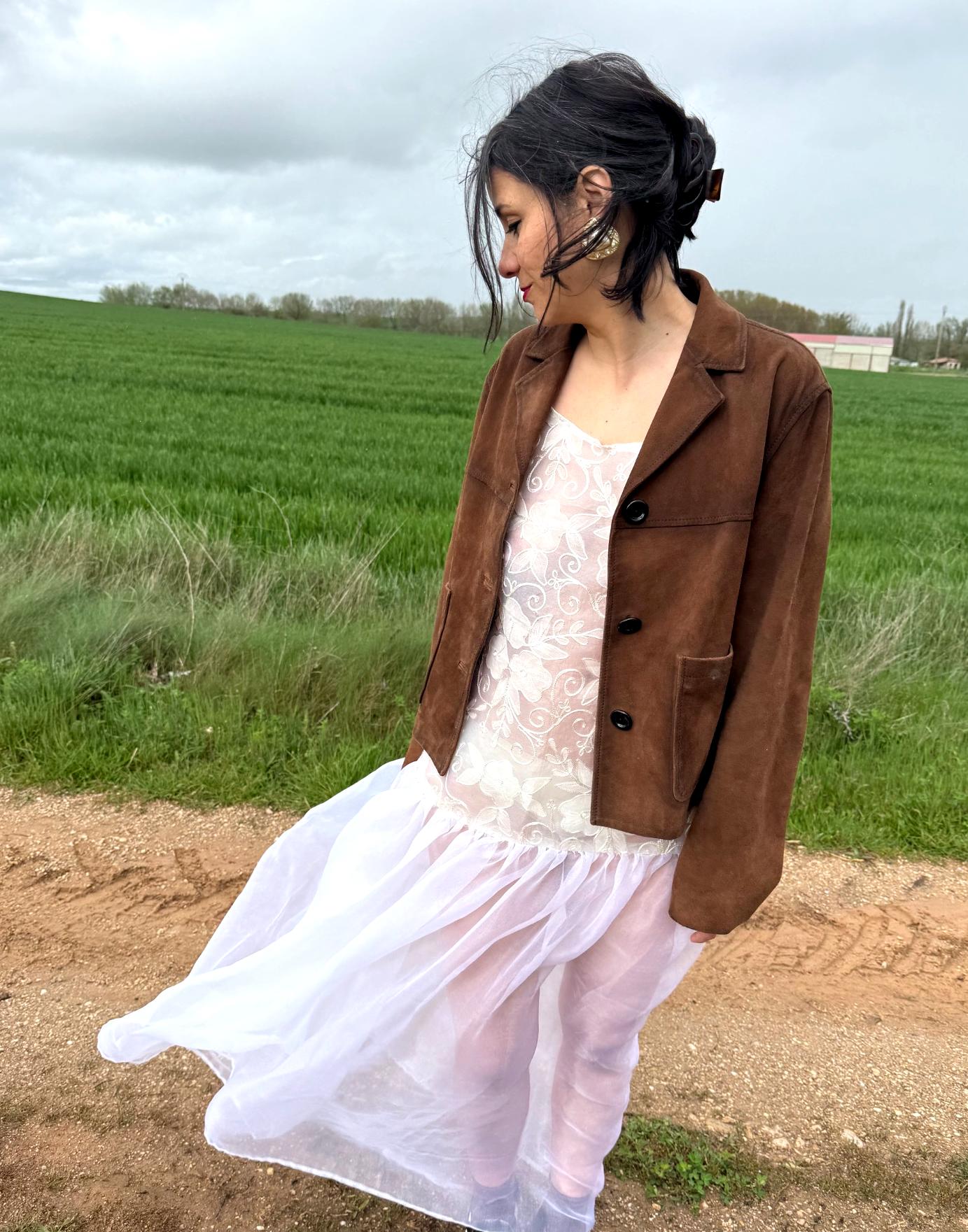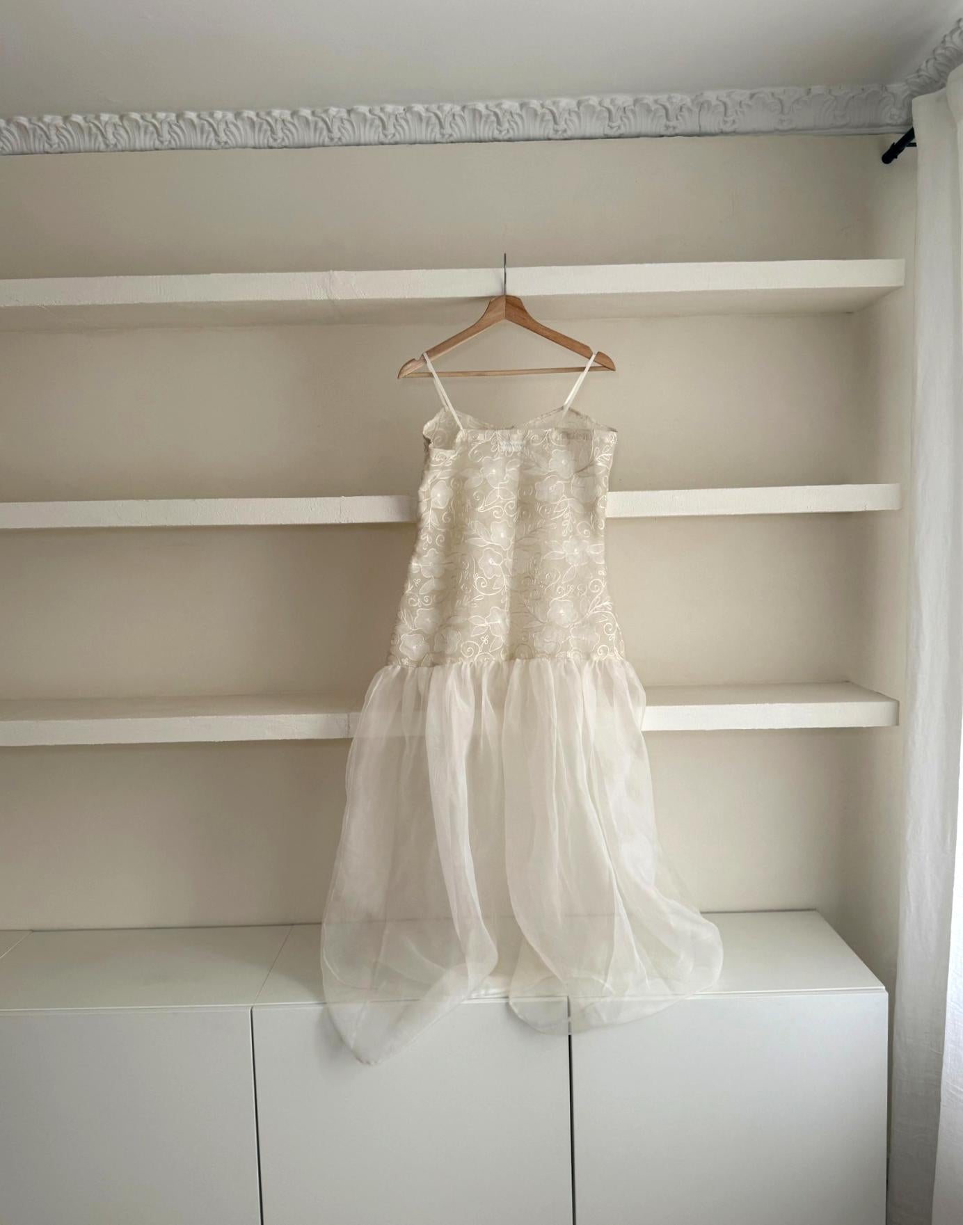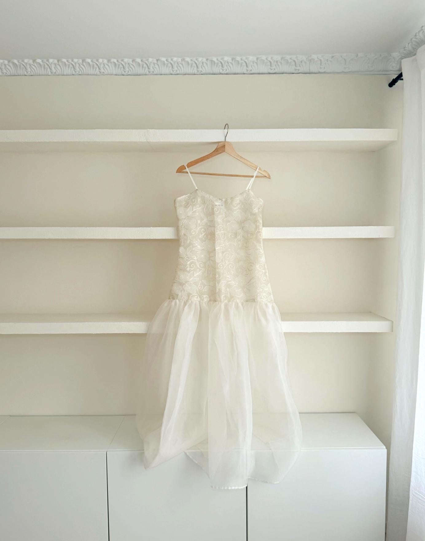 Romantic, delicate, and fluid, the Pieces 02 Dress brings together a fitted floral bodice with a soft, flowing silk skirt for an effortless blend of structure and movement. Handcrafted in Burgos using carefully sourced fabrics — the embroidered top from Barcelona and the natural silk bottom from Shanghai — this piece balances timeless romance with a relaxed feel.