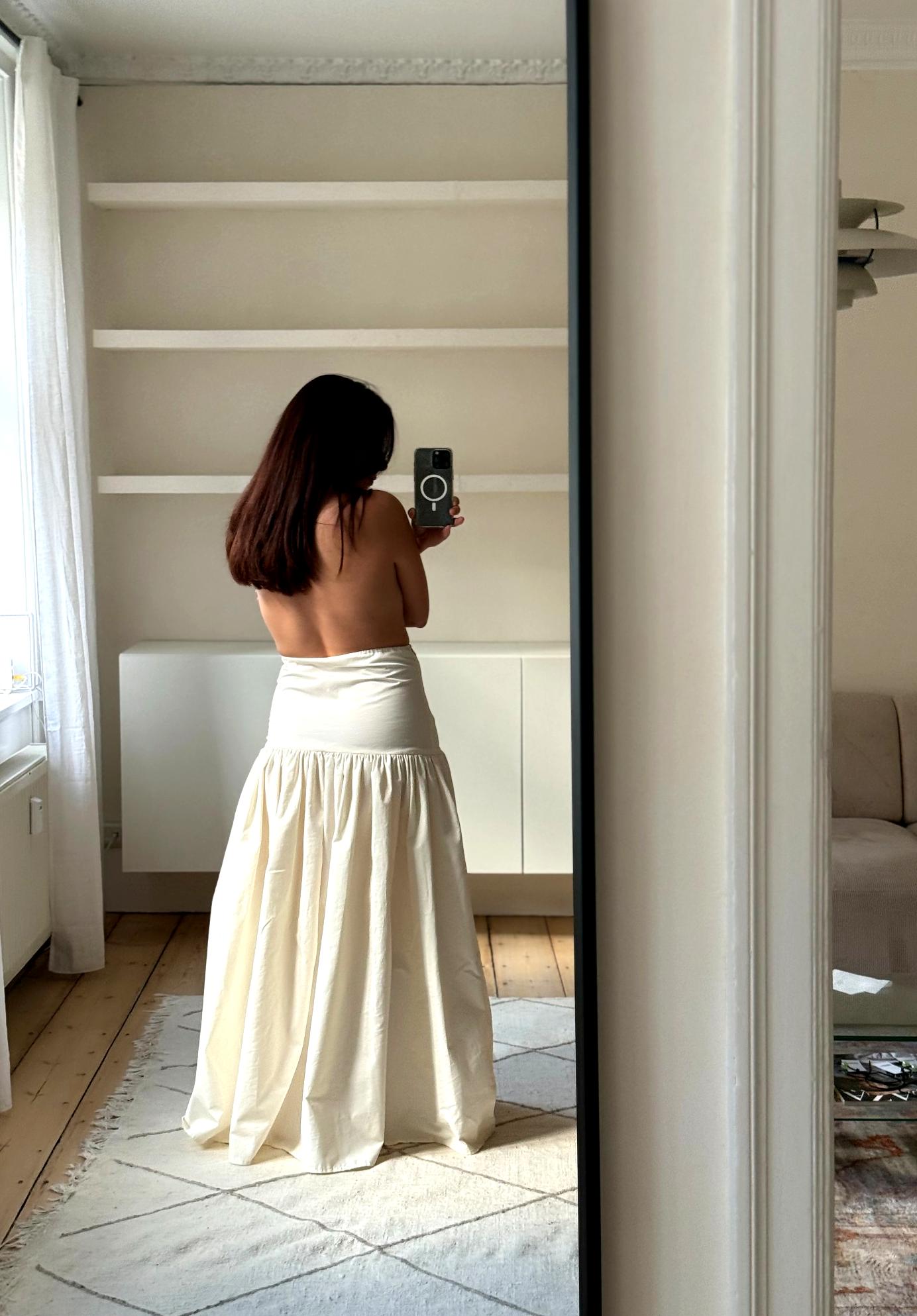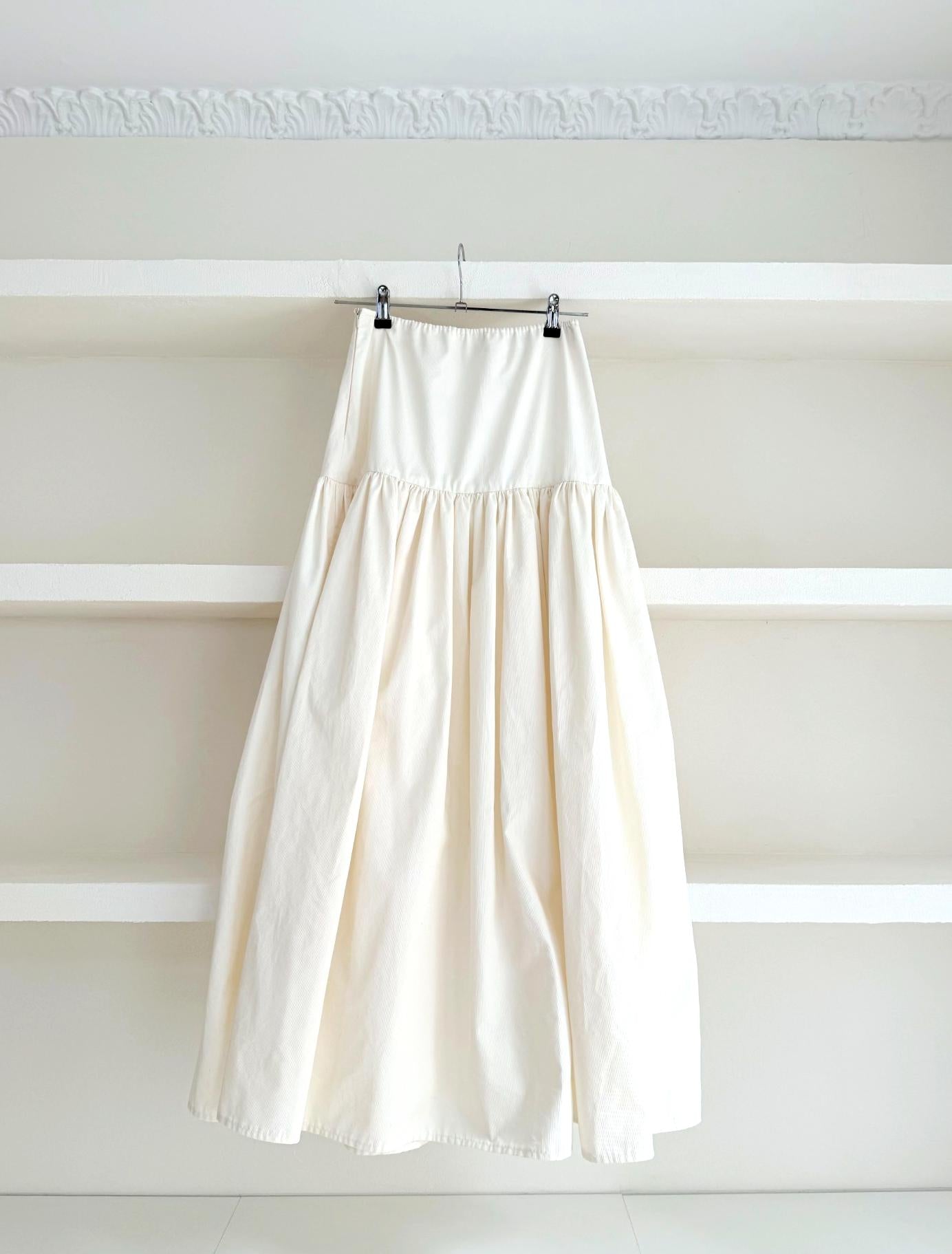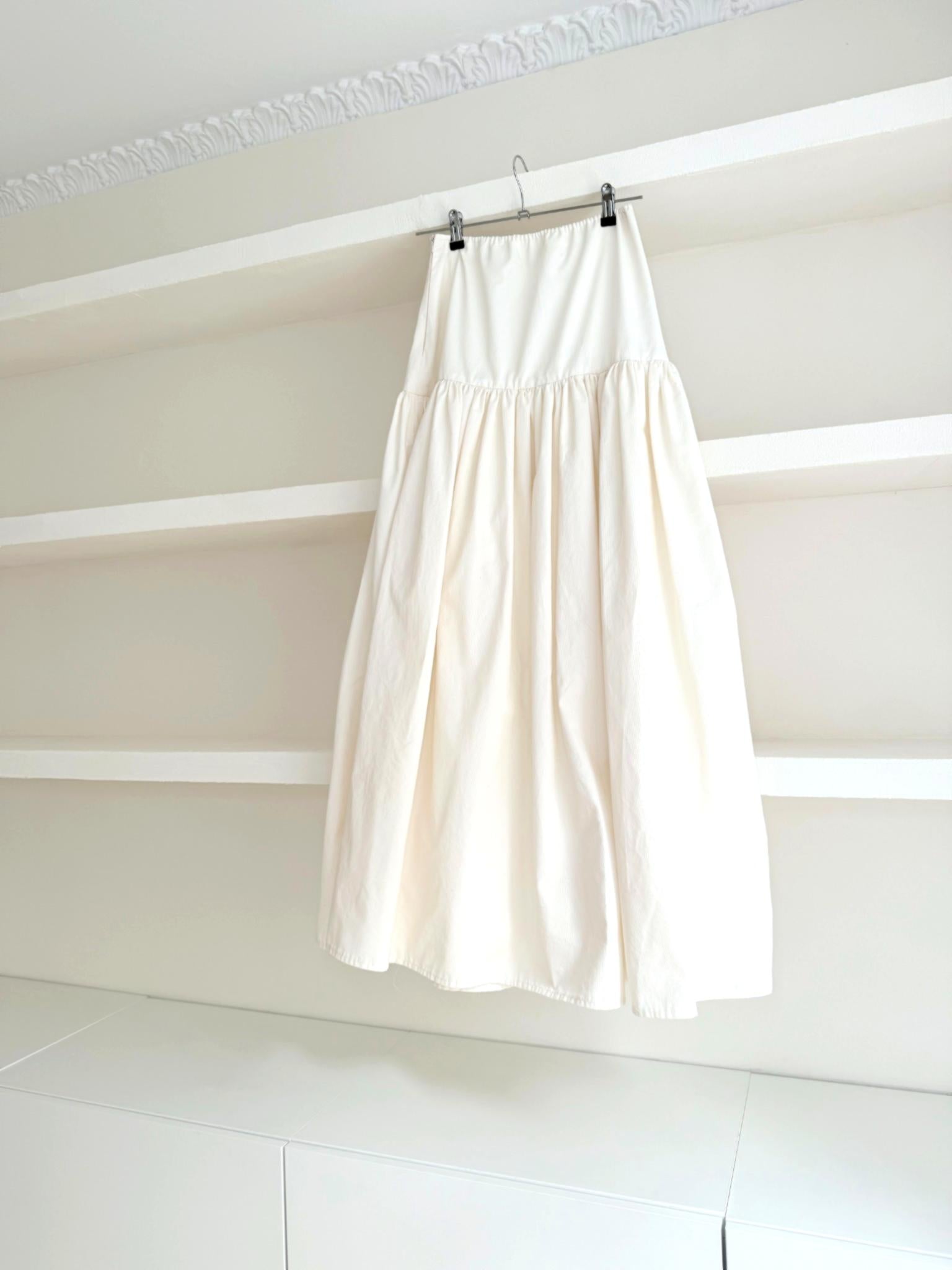 Made in Burgos using a soft cotton sourced from a local mercería in Barcelona, this piece blends an easy, flowing silhouette with a gently fitted top section. The elasticated waistband shapes comfortably to your body, while the gathered lower half adds soft volume and movement, making it the perfect piece to drift through any day.